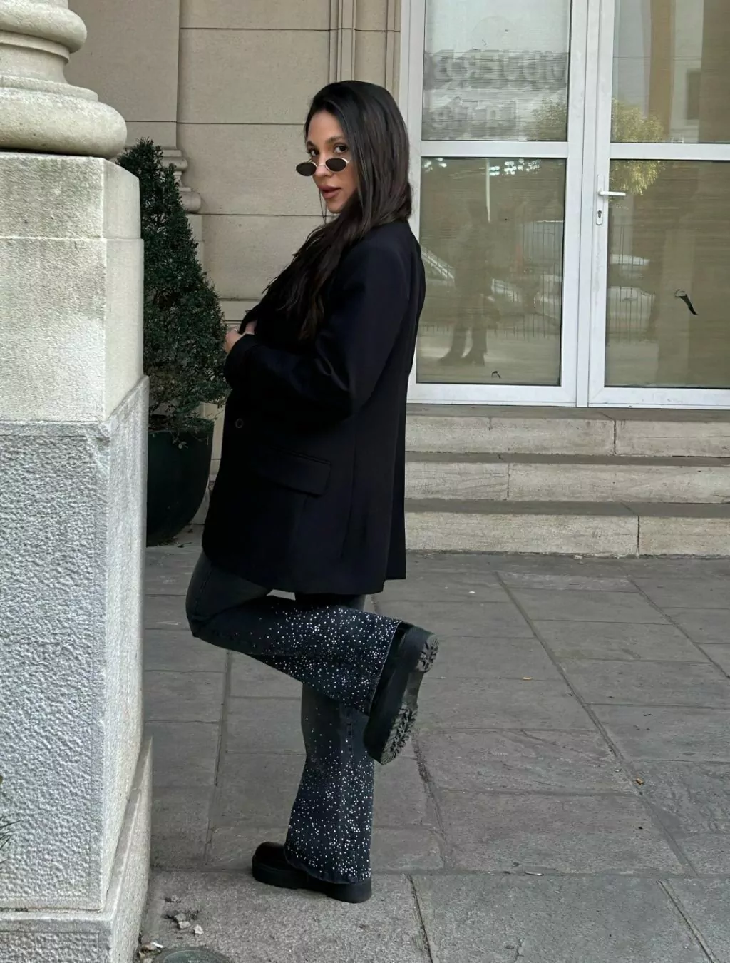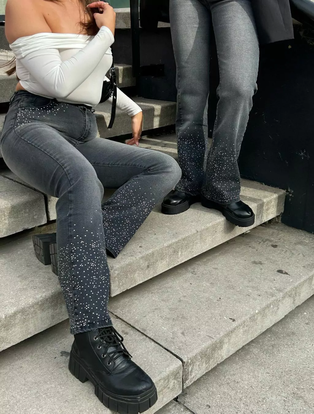 Jean color gris desgastado, corte oxford, elastizado tiro alto. Intervenido con lluvia de strass termoadhesivo plateado en la botamanga y bolsillos.