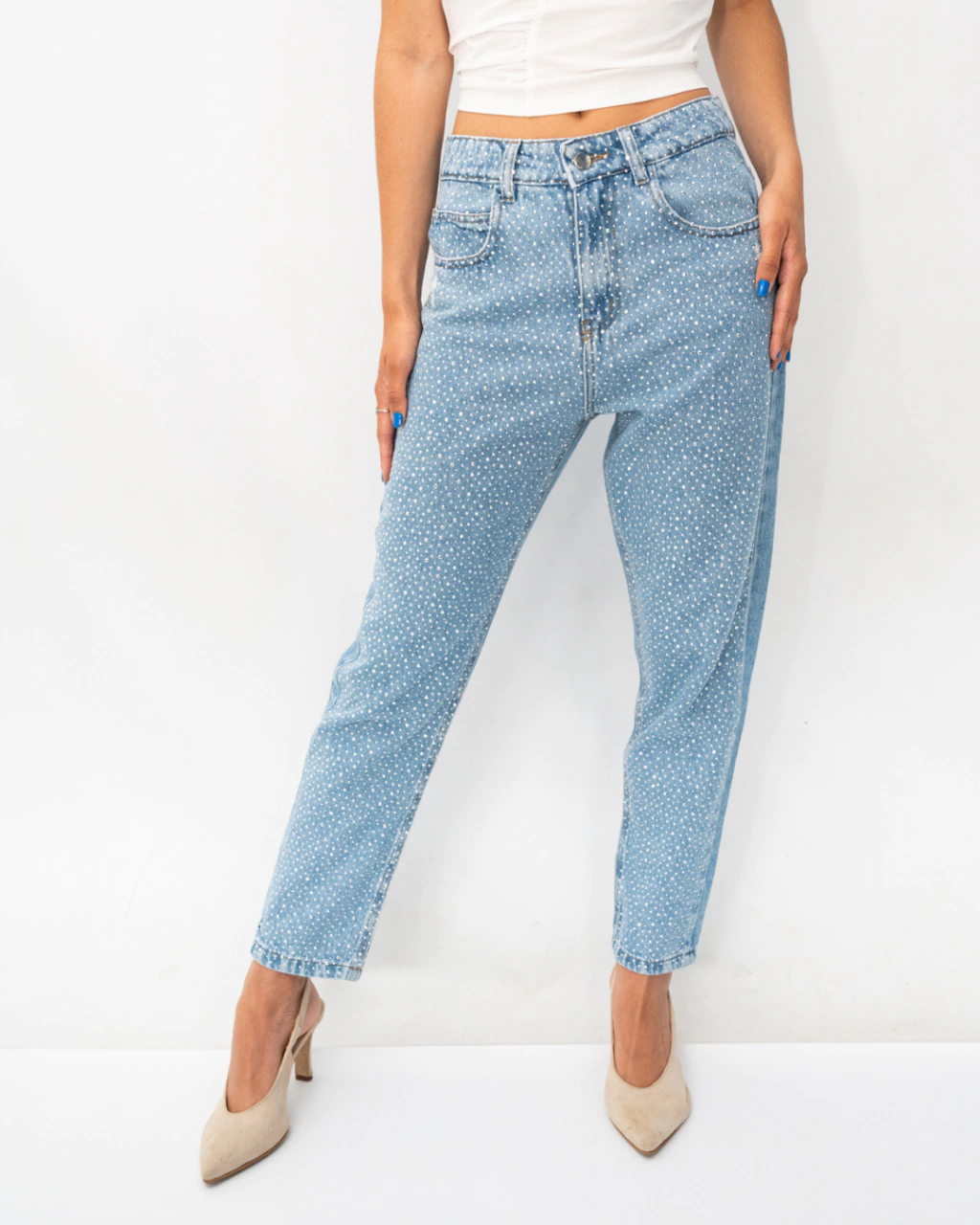 Jean rígido color celeste corte mom, tiro alto, intervenido a mano con full strass plateado en toda la parte delantera.