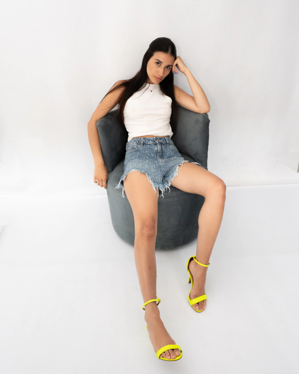 Short de Jean rígido color azul oscuro, desflecado tiro alto. Intervenido con strass plateado en la parte delantera
